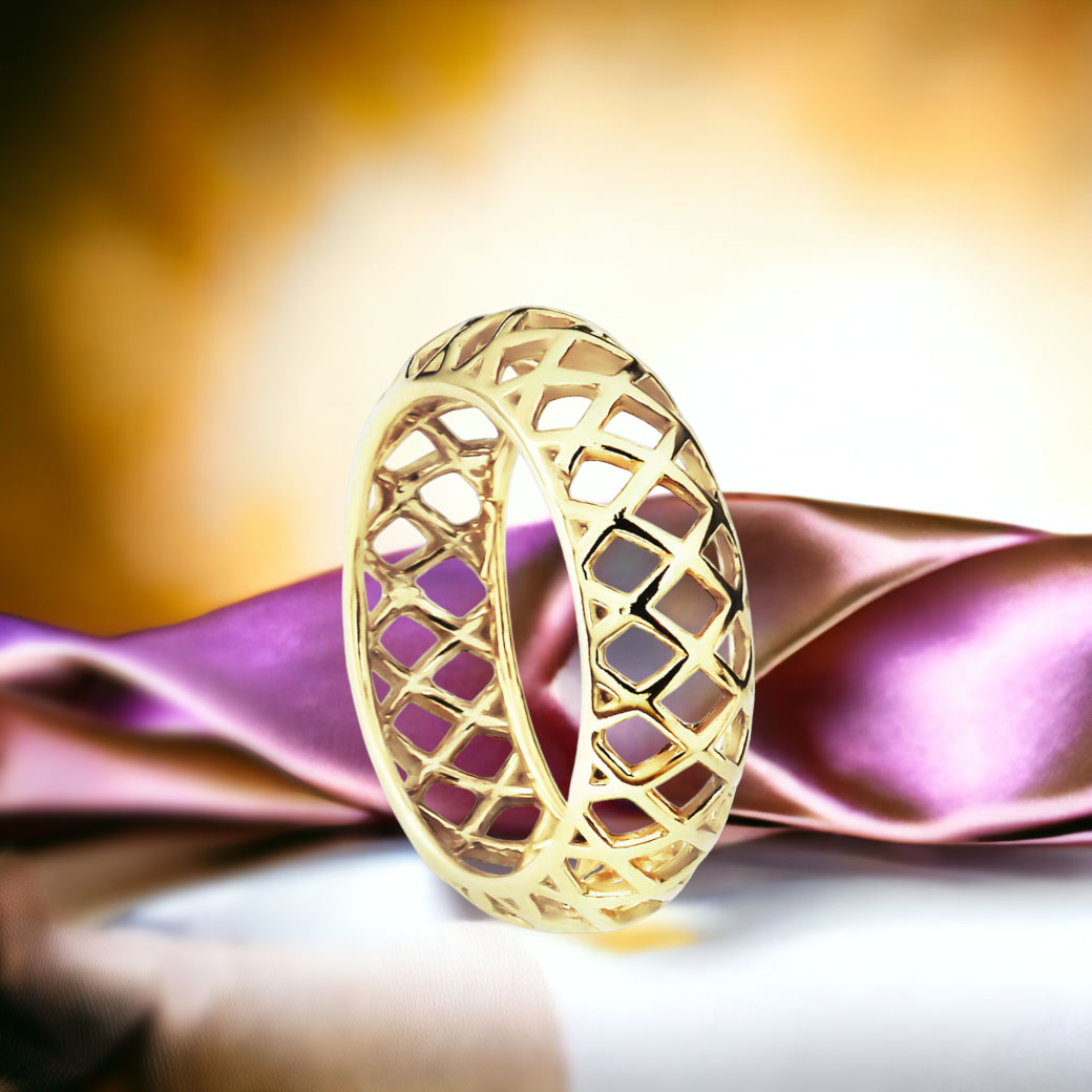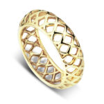 Coś dla fanek niebanalnej i niecodziennej biżuterii. Wzór ażurowy zdobi obrączkę na całej powierzchni, a sam kształt jest delikatnie wypukły tworząc efekt “oponki”.