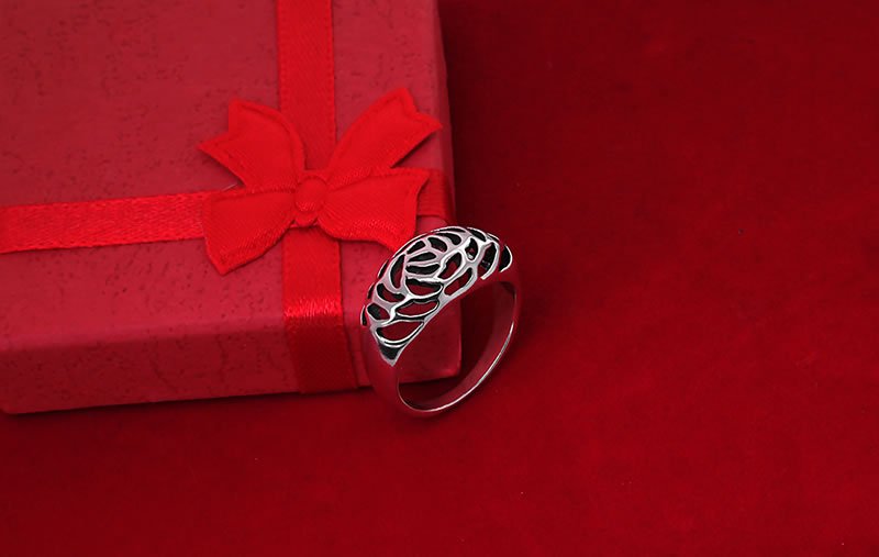 Piękny i wyjątkowy pierścionek z ażurowym, szerokim motywem.