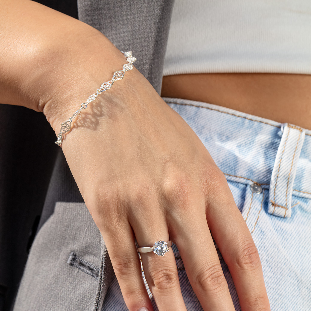 Wysokiej jakości bransoletka damska wykonana w całości z czystego srebra próby 925. Długość bransoletki wynosi 19cm, szerokość ogniwa 5,4mm, grubość ogniwa 0,7mm. Doskonale nadaje się na prezent dla każdej kobiety. Wyjątkowy wzór i wysoka jakość wykonania zapewnia trwałość na wiele lat. Waga bransoletki 2,8g.