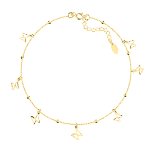 Bransoletka na nogę wykonana ze srebra próby 925, ozdobiona subtelnymi, ruchomymi motylkami. Każdy z motylków oddzielone jest kuleczką. Idealna do codziennego noszenia, jak i na specjalne okazje.
