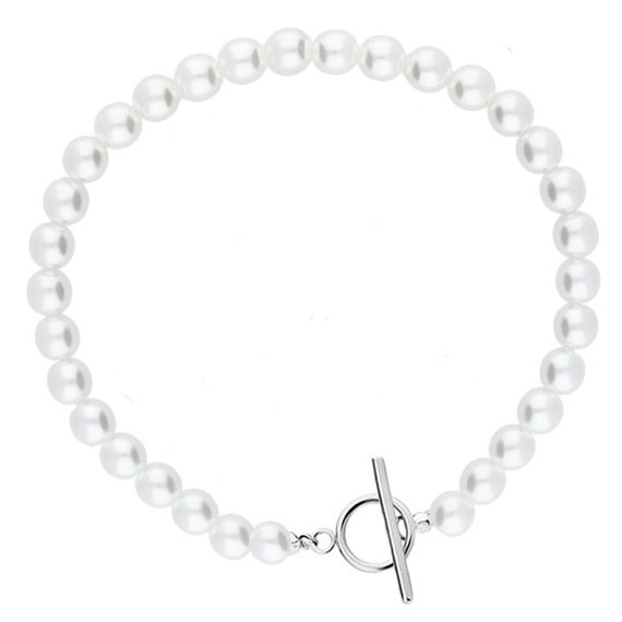 Bransoletka ozdobiona perełkami (syntetyczne) o średnicy 6 mm. Zapięcie wykonane ze srebra próby 925.