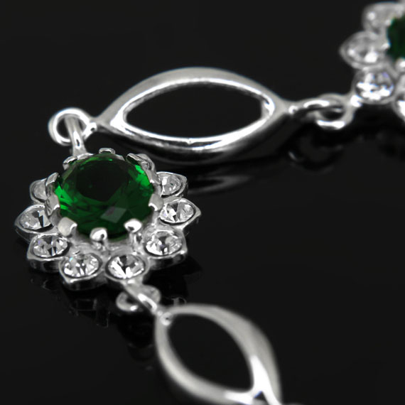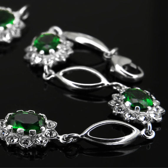 Kamienie – zielone cyrkonie – osiągają wymiary 8×6 mm. Okalające je białe cyrkonie osiągają średnicę 2 mm każda. Bransoletka składa się z 5 ogniw w kształcie kwiatów (o wymiarach 15×12 mm) i 5 ogniw w kształcie gładkiej łezki (o wymiarach 12×7 mm).