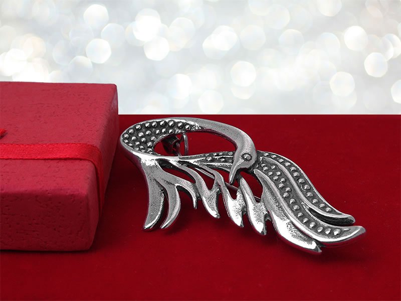 Broszka wykonana została z oksydowanego srebra próby 925.