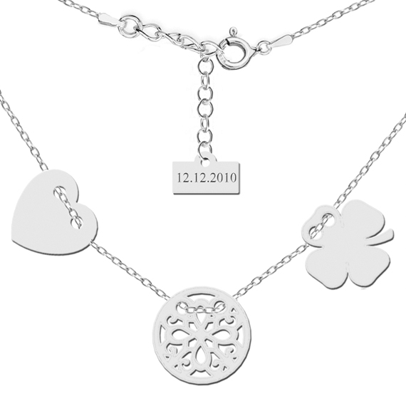 Łańcuszek o splocie typu ankier ozdobiony zawieszkami w kształcie: pełnego serca, ażurowego kółka i koniczynki. Zawieszki o wysokości ok. 1,25 cm.