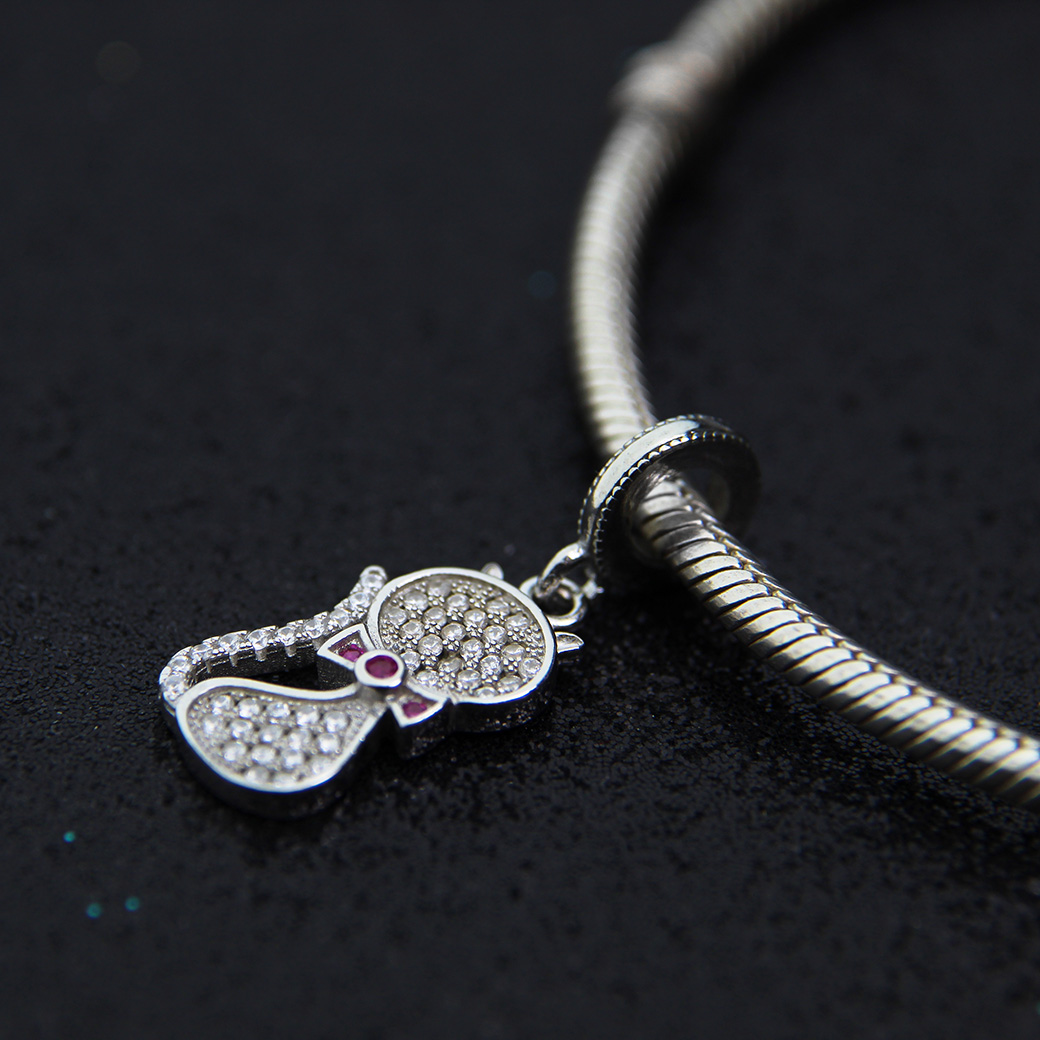 Charms w kształcie kota to niezwykle uroczy dodatek do biżuterii, który docenią miłośnicy tych uroczych zwierząt. Ten mały kotek może być wyrazem Twojej pasji do kotów lub symbolizować Twoją tajemniczą stronę. Charms z kotem to także doskonały sposób na wyrażenie swojej indywidualności i dodanie charakteru do swojej bransoletki. Charms wypełniony jest białymi i różowymi cyrkoniami.