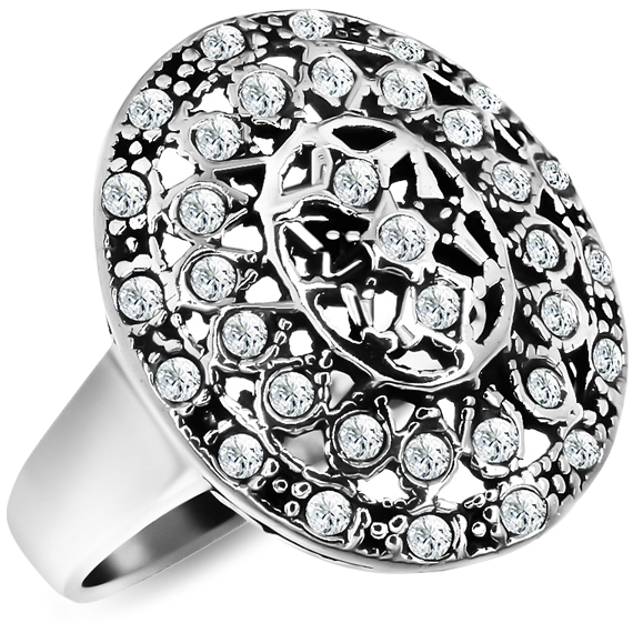 Owalny, zdobiony przód pierścionka wysadzany jest licznymi białymi cyrkoniami o średnicy 1 mm.