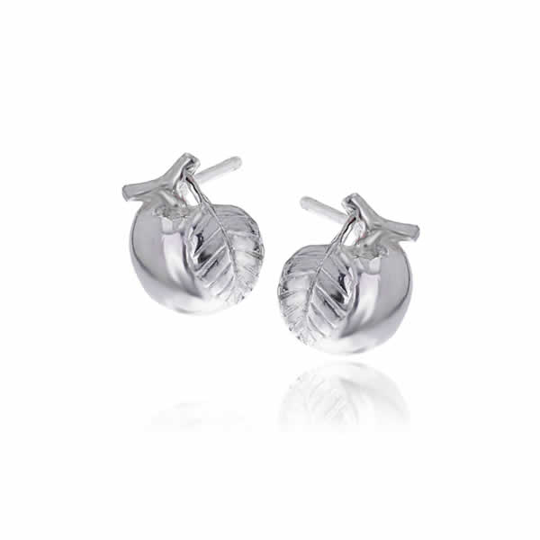 Kolczyki wykonane w całości ze srebra próby 925. Zdobione liściem jabłuszko mierzy 1,3cm długości, 1,2cm szerokości i 5,2mm grubości, waga pary: 2,1g.