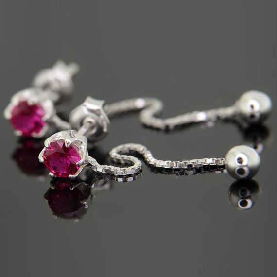 Ozdobione cyrkonią w kolorze fuksji, osadzoną w srebrnym koszyczku. Kamień osiąga 5 mm średnicy.