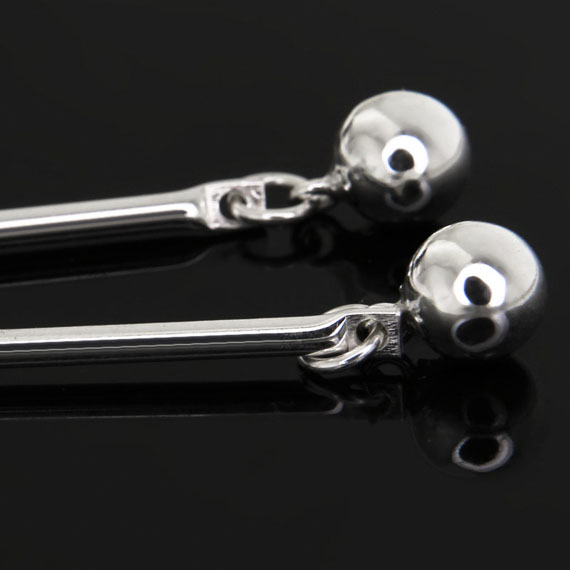 Posiadają wygodne zapięcie typu angielskiego. Kolczyki składają się ze srebrnych patyczków o długości 4 cm połączonych za pomocą ogniw z kulką o średnicy 7 mm.
