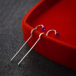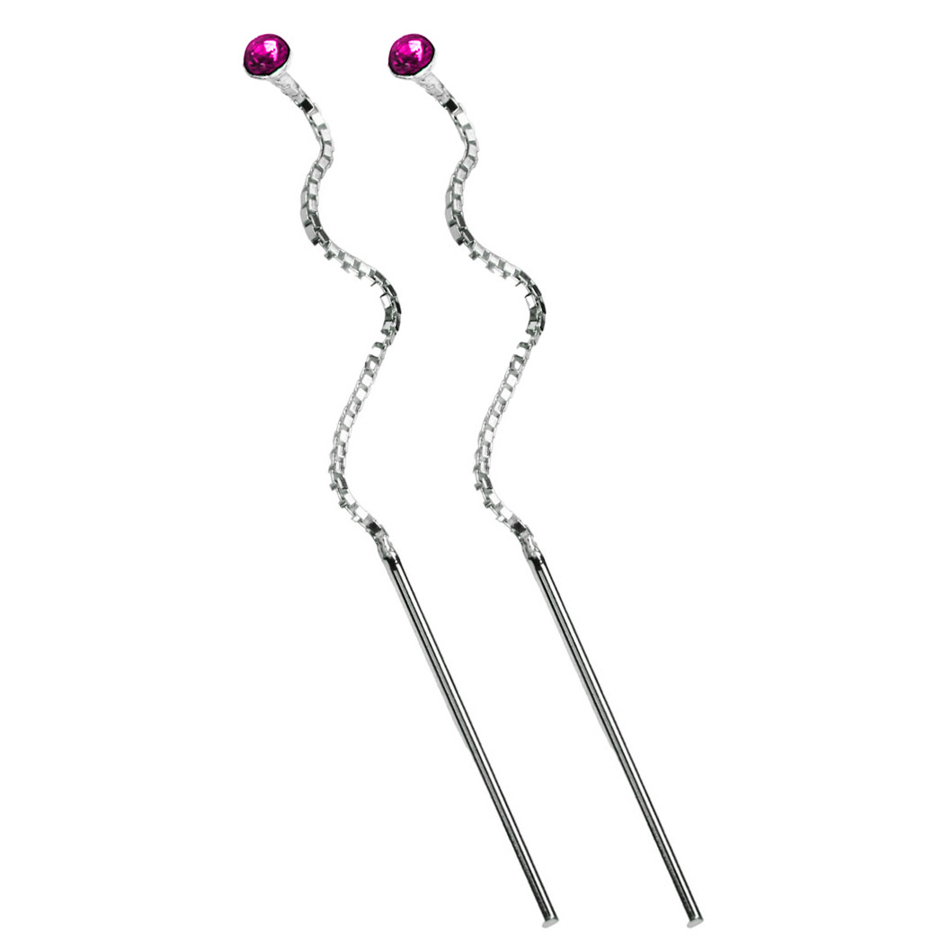 Kolczyki przekładane – przeciągane przez ucho. W dziurce ucha “blokuje się” część z cyrkonią, a reszta łańcuszka swodobnie zwisa i pięknie zdobi owal twarzy! Kolczyki nie przesuwają się w czasie noszenia i wyglądają niezwykle atrakcyjnie za sprawą 2,5 mm cyrkonii.