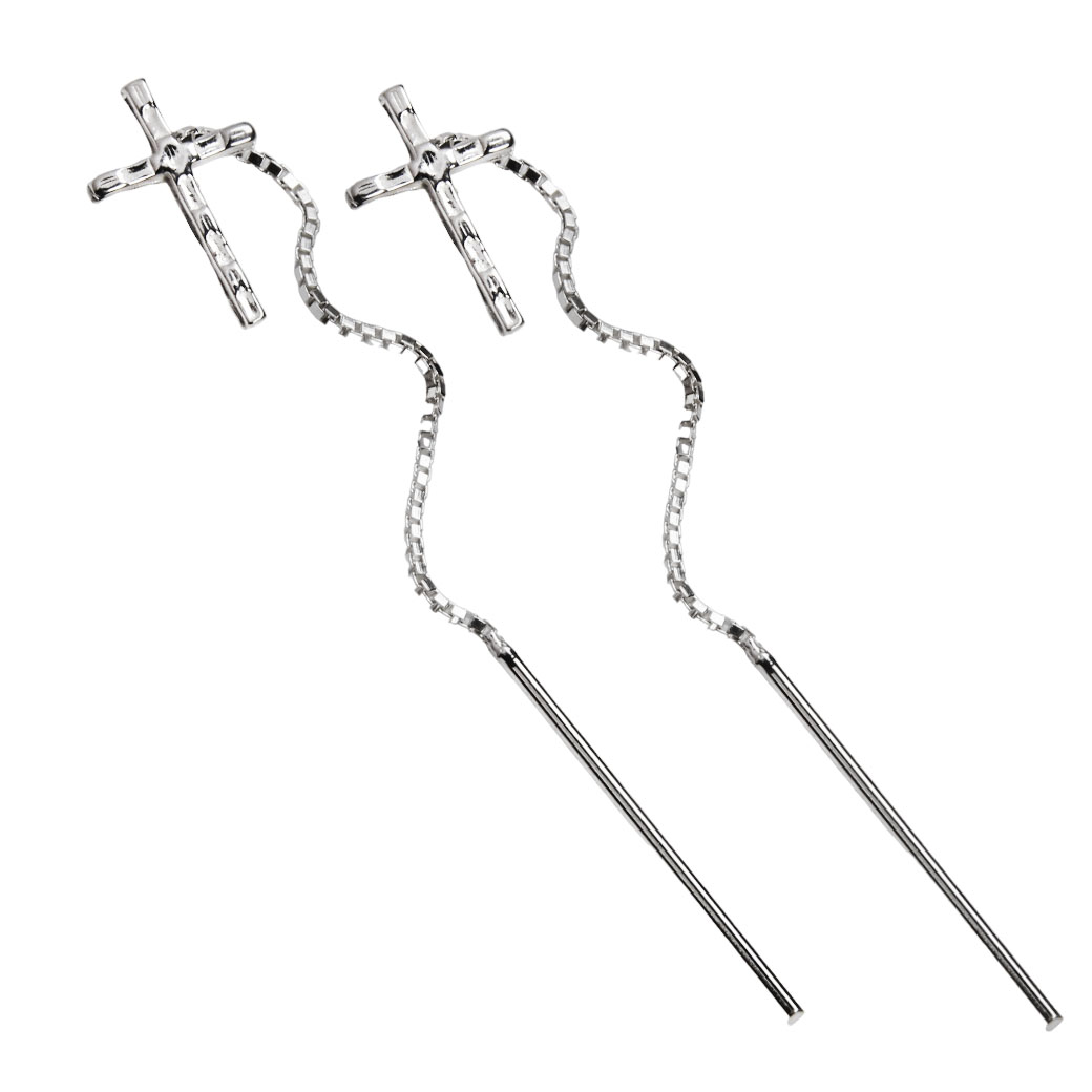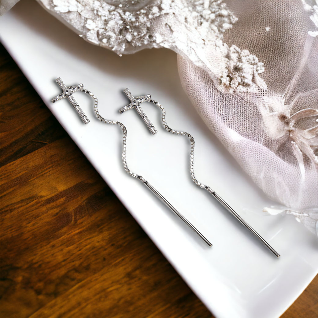 Wszyscy je uwielbiają! Kolczyki przekładane przez ucho z delikatnym łańcuszkiem! To świetna opcja na co dzień. Kolczyki są wygodne w noszeniu, “blokują” się na uchu, dzięki czemu się nie zsuwają i nie spadają. Ozdobione wzorem wzorzystego krzyżyka.