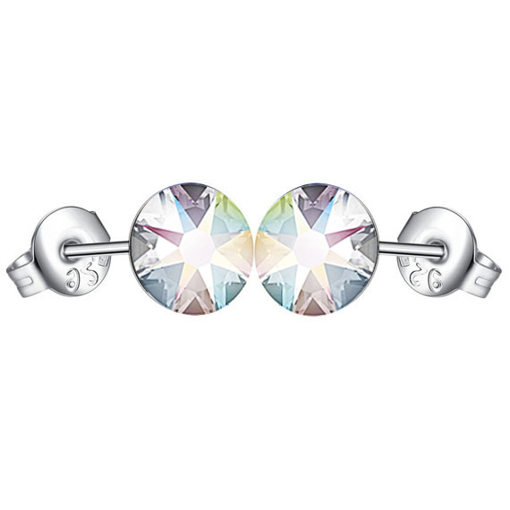 Kolczyki zdobią okrągłe cyrkonie swarovskiego opalizujące w pastelowych odcieniach o średnicy 6 mm.