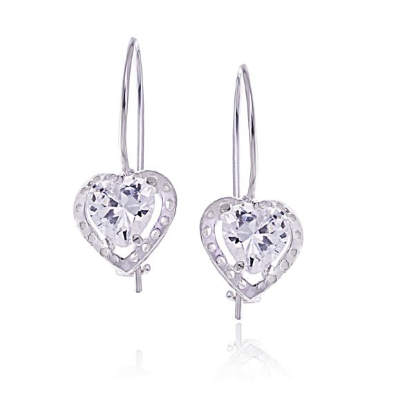 Kolczyki ozdobione są niezwykle przyciągającymi wzrok białymi cyrkoniami w kształcie serca, która przepięknie się mienią (wymiary cyrkonii: 7x7mm). Serce z cyrkonii umieszczone jest na obrysie serca. Kolczyki posiadają wygodne zapięcie typu bigiel. Biżuteria wygląda niezwykle atrakcyjnie, dlatego też doskonale sprawdzi się na prezent dla ukochanej kobiety. Wzór serca będzie doskonałym odzwierciedleniem uczuć do wybranki. Wyjątkowy wygląd i wysoka jakość wykonania zapewnia trwałość na wiele lat. Całkowita długość kolczyka (wraz z zapięciem): 2,7cm, waga pary: 2,8g.