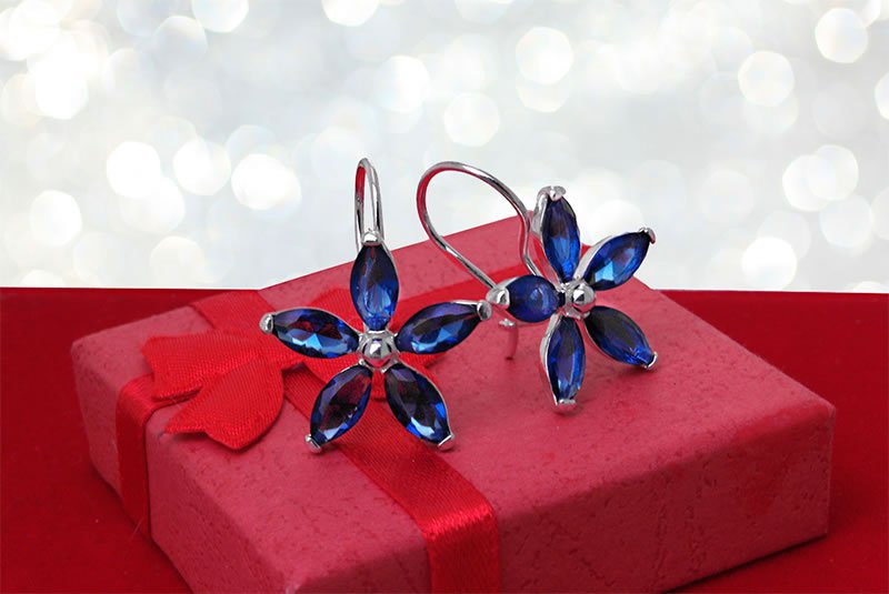 Ozdobione szafirowymi cyrkoniami w kształcie markizy o długości 7,5 mm i szerokości 4 mm.