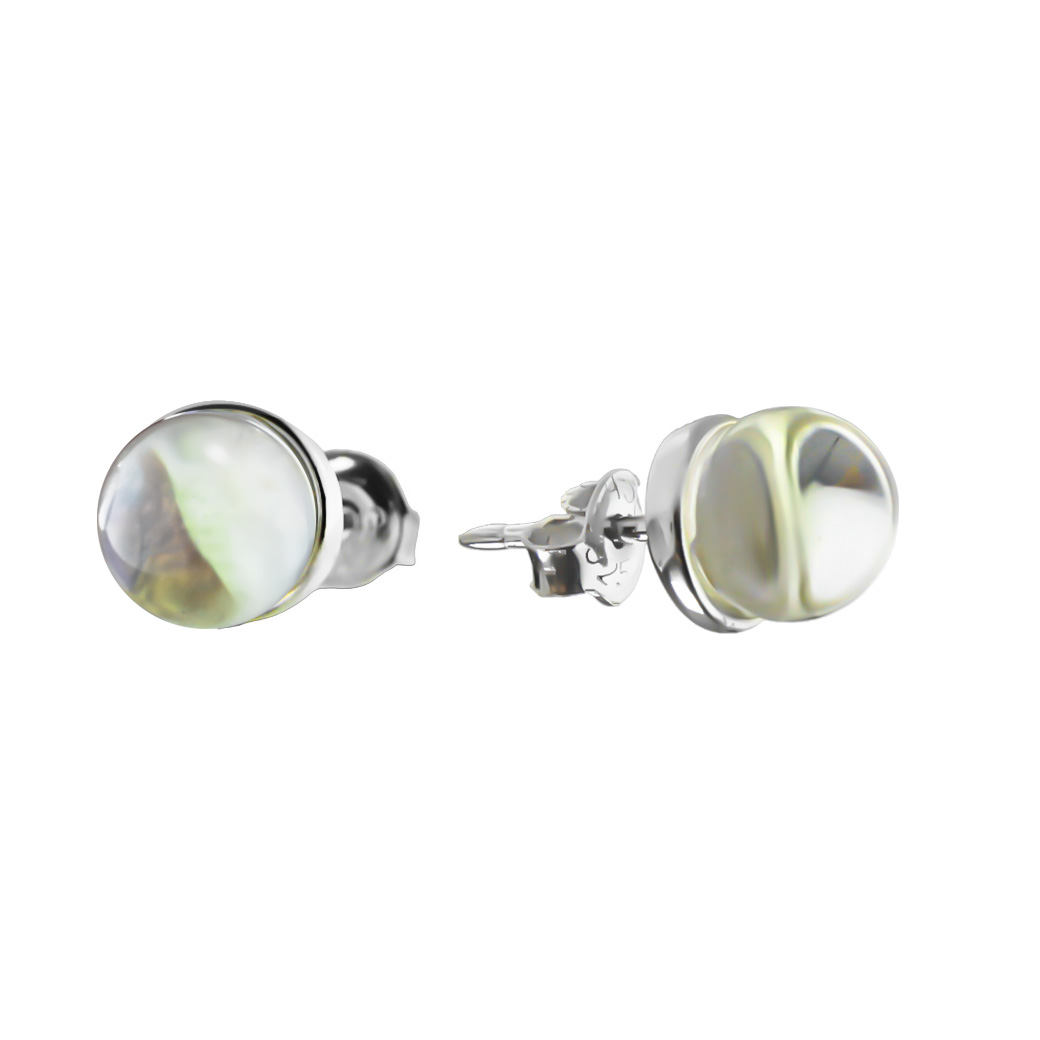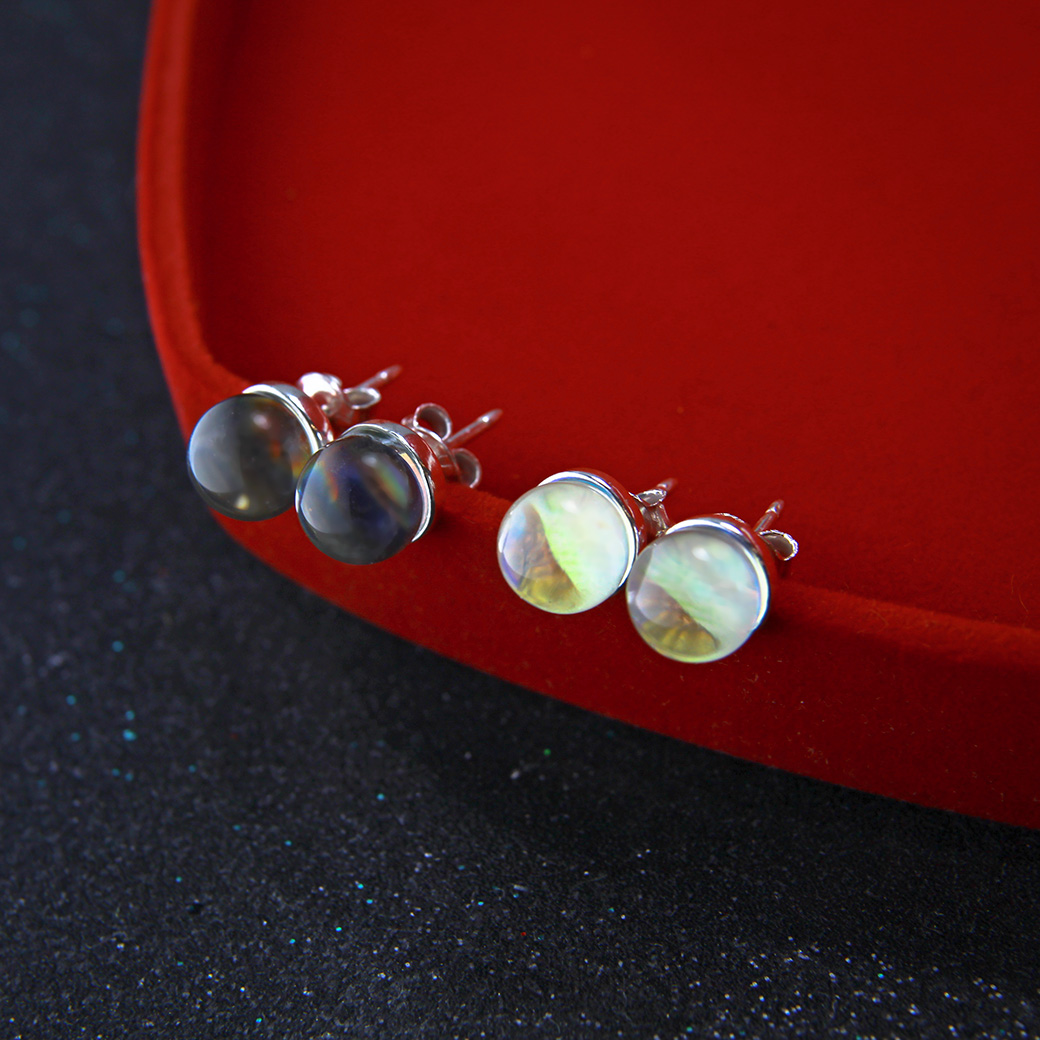 Kolczyki ze szklanym kamieniem opalizującym na jasne barwy beżu, pastelowych żółci i szarości.