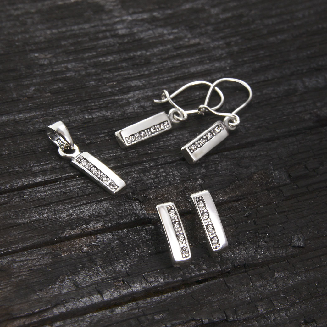 Kolczyki ozdobione prostokątem, w połowie ozdobionym pasem kolejno ułożonych białych cyrkonii. Kolczyki z wygodnym zapięciem typu sztyft.