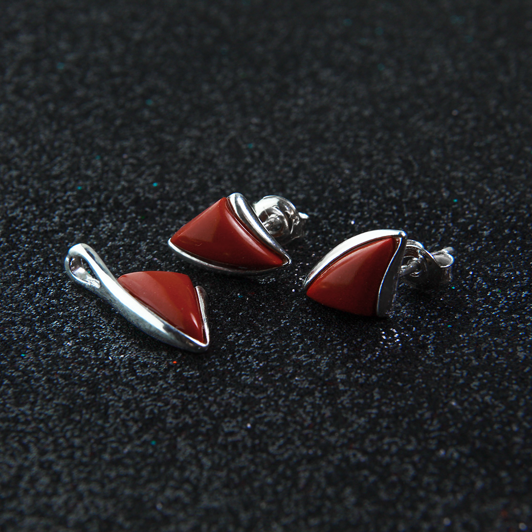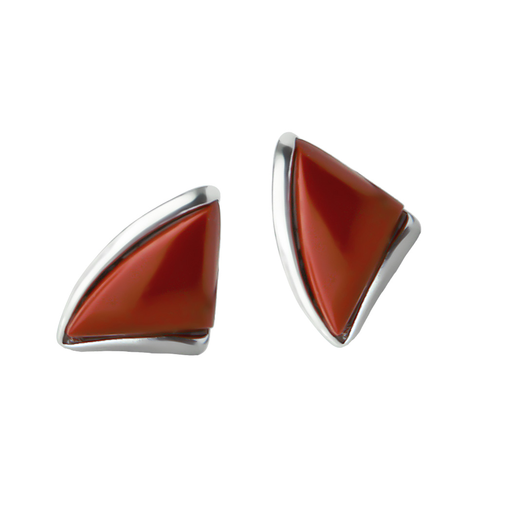 Kolczyki wykonane ze srebra próby 925, w trójkątnej ramce zamknięty syntetyczny kamień imitujący koral.