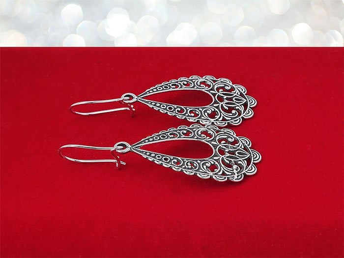 Piękne, ażurowe kolczyki, bogato zdobione. Wykonane w całości z oksydowanego srebra próby 925. Posiadają wygodne zapięcie typu bigiel. Kolczyk osiąga 5,4cm (wraz z zapięciem), 2,2cm szerokości i 0,8mm grubości. Waga pary: 5,6g.