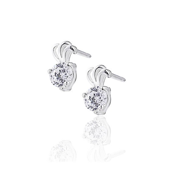 Drobne i subtelne kolczyki wykonane przy użyciu srebra próby 925. Atrakcyjny kształt kolczyka ozdobiony został białą cyrkonią o średnicy 5mm. Posiadają wygodne zapięcie typu sztyft. Całkowita wysokość kolczyka: 9mm, szerokość 5,2mm, grubość 3mm. Waga pary: 1,2g.
