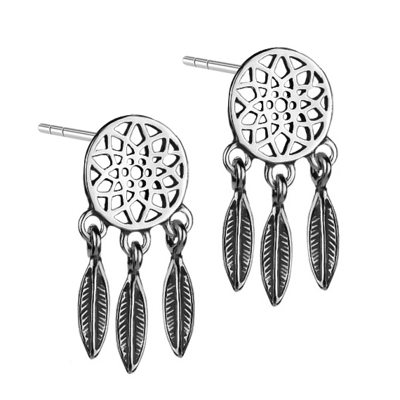 Przepiękne kolczyki z zapięciem typu sztyft. Ozdobione wzorem łapacza snów, który osiąga długość 2,7 cm i 1,2 cm szerokości.