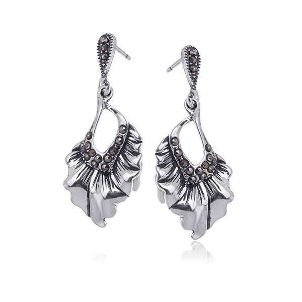 Kolczyki wykonane zostały z wysokiej jakości oksydowanego srebra próby 925. Ozdobione licznymi markazytami o średnicy 1,5mm. Na pojedynczym kolczyku znajdziemy 15 kamieni. Posiadają wygodne zapięcie typ sztyft, które jest niewidoczne podczas noszenia, a jednocześnie pięknie prezentuje biżuterię i chroni przed jej zgubieniem. Całkowita długość kolczyka: 4cm, szerokość: 1,6cm. Waga pary: 4,8g.