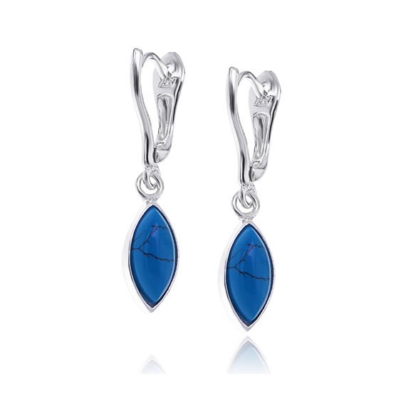 Kolczyki wykonane ze srebra próby 925, osadzony kamień syntetyczny – turkus, mierzy 1,2cm długości i 6mm szerokości. Kolczyki z wygodnym zapięciem typu angielskiego. Waga pary: 3,8g.