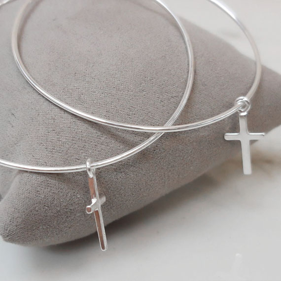 Piękne i modne kolczyki – klasyczne kółka z zawieszoną ozdobą krzyżyka.