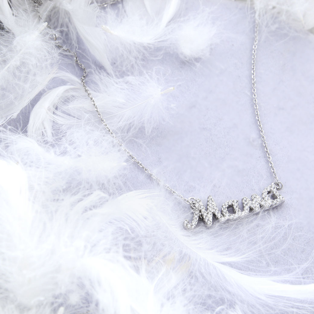 Łańcuszek zdobi wymowny napis “Mama”, który w całości ozdobiony został białymi cyrkoniami
