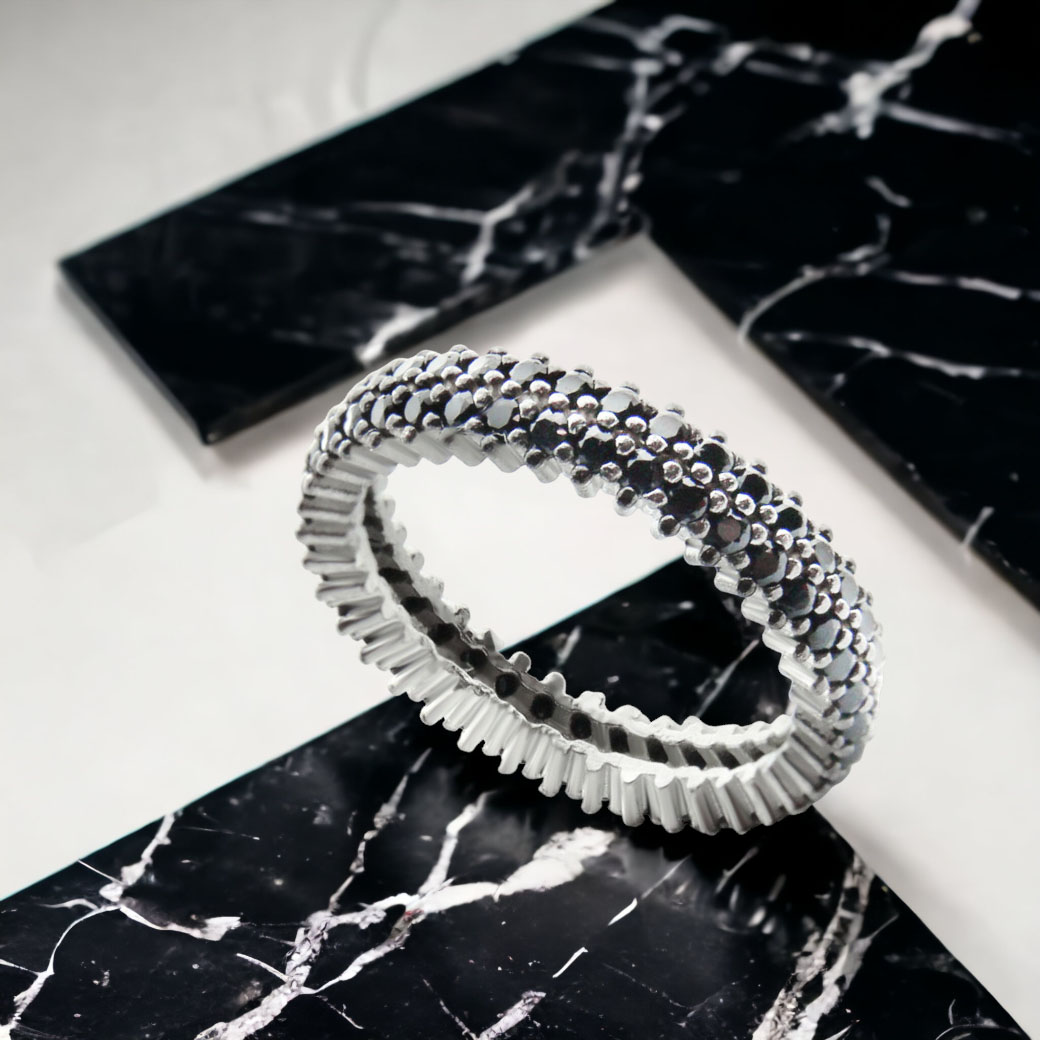 Na całym obwodzie obrączki zdobią je czarne 1 mm cyrkonie ułożone w dwóch rzędach. Obrączka wykonana z wysokiej jakości srebra próby 925.