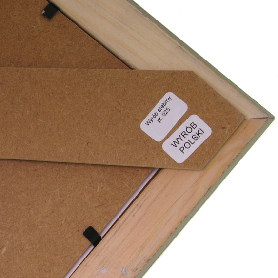 Umieszczony został w drewnianej, lakierowanej ramce w kolorze srebrnym.