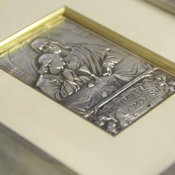 Srebrny obrazek idealnie nadający się jako pamiątka I Komunii Świętej.
