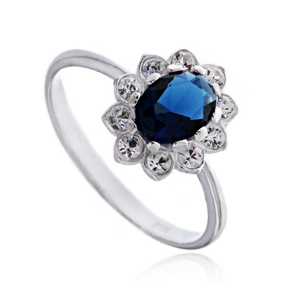 Niezwykle efektowny srebrny pierścionek wykonany z połączenia srebra próby 925 i pięknie mieniących się kamieni. Pierścionek zdobi szafirowa cyrkonia o wymiarach 8x6mm osadzoną na 10 nóżkach. Wokół niej umieszczony jest dodatkowo rząd białych cyrkonii o średnicy 2mm. Kamienie układają się w piękny wzór kwiatka. Zdobiony przód pierścionka mierzy 14mm wysokości, 12mm szerokości i 5mm grubości. Wysokość obrączki: 2mm. Waga: 2,9g.