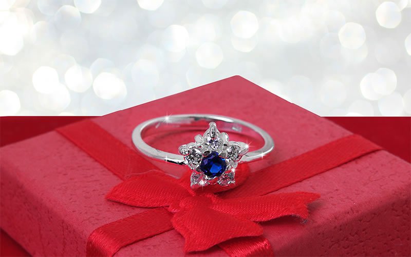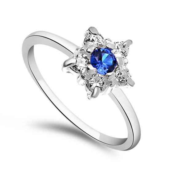Pierścionek zdobią białe cyrkonie o średnicach 3 mm i jedna większa szafirowa o średnicy 4 mm.