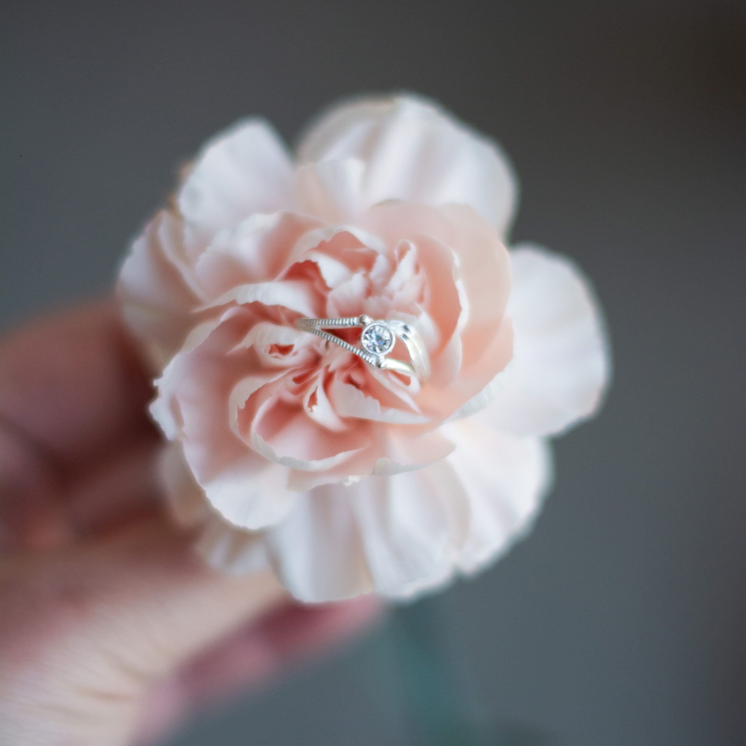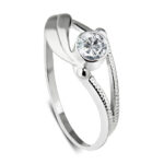 Wwjątkowy design podkreśla harmonię kontrastu między gładkim liściem a finezyjnym nacinanym zdobieniem na przedniej części. W centralnej części pierścienia osadzony jest błyszczący kamień – piękna cyrkonia, dodając mu blasku i nadając całej kompozycji niepowtarzalnego uroku.