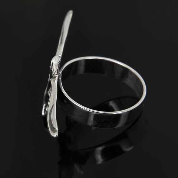 Pierścionek zdobi kruk o szerokości 4,5 cm. Pierścionek po założeniu przykładowo na palec środkowy, sprawia że rozłożyste skrzydła kruka zdobią również palec wskazujący i serdeczny.