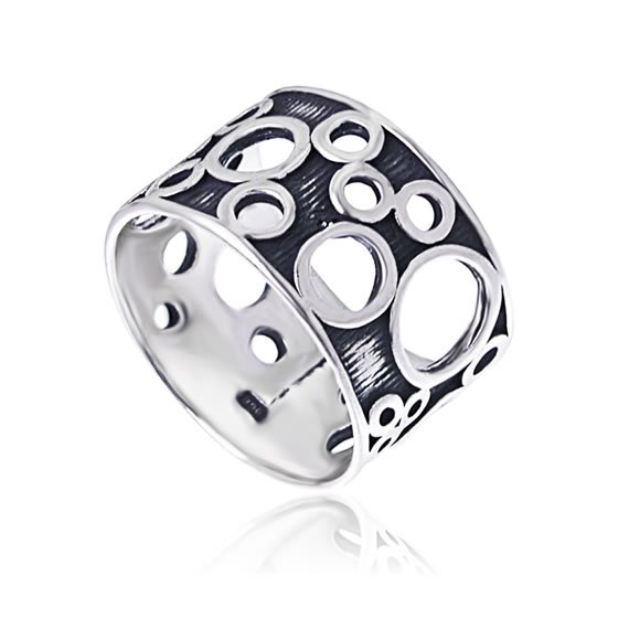 Wykonany z materiałów najwyższej jakości – oksydowanego srebra próby 925. Niezwykle atrakcyjny kształt i przyciągający uwagę wzór skradnie serce wszystkim miłośniczkom dużych pierścionków. Pierścionek z każdej strony jest tej samej wysokości – osiąga 12mm. Wysoka jakość wykonania zapewnia trwałość na wiele lat. Całkowita waga pierścionka: 3,9g.