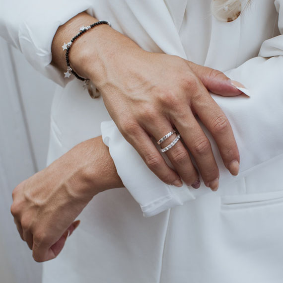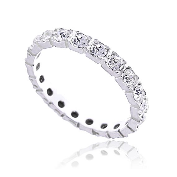 Obrączka w klasycznym, prostym kształcie wykonana z wysokiej jakości srebra próby 925. Obrączka ozdobiona została 20 białymi kamieniami. Obrączka mierzy 3mm wysokości i 2mm grubości. Waga całkowita: 2,6g.