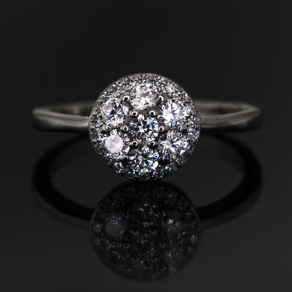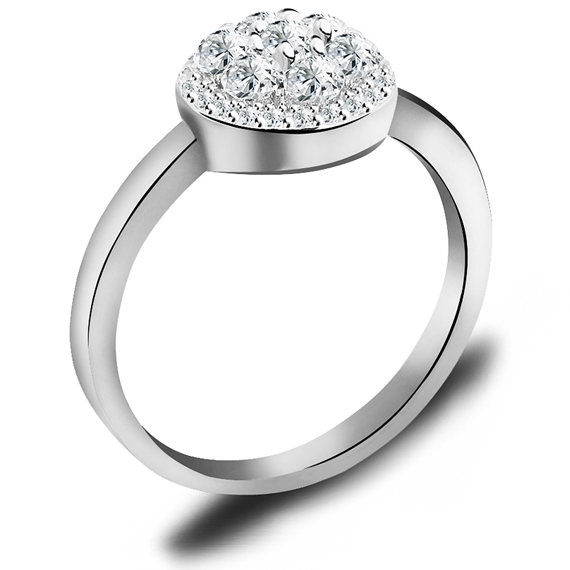 Główną część pierścionka zdobią liczne kamieni – cyrkonie o średnicy 3 i 1 mm. Całość umieszczona w przekroju koła o średnicy 9 mm.