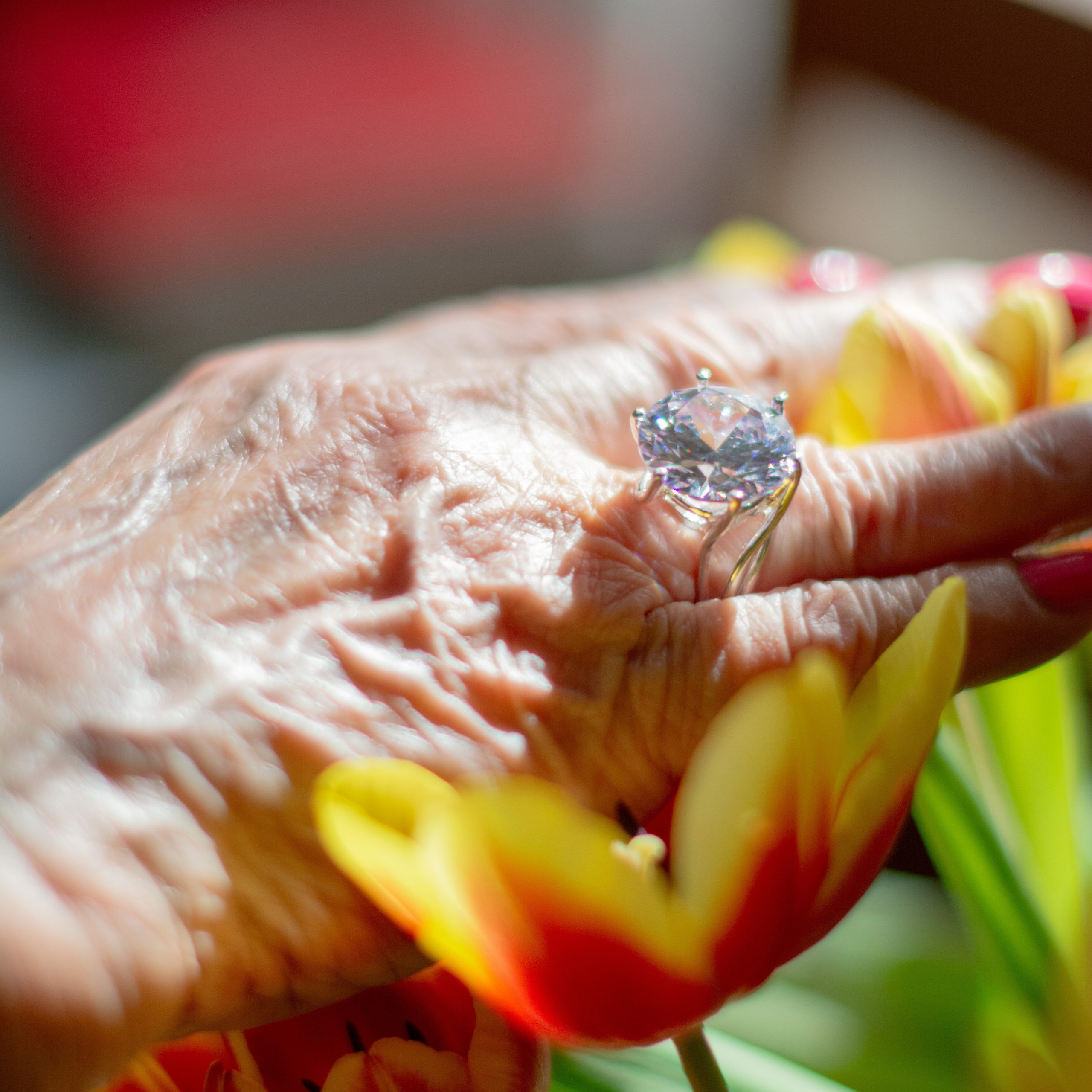 Przód pierścionka osiąga 2cm średnicy, i 1,2cm grubości. Obrączka mierzy 4,3mm wysokości i 1mm grubości.