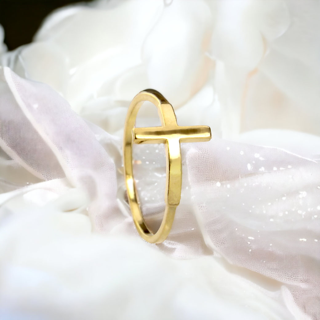Krzyż został perfekcyjnie wpleciony w obrączkę pierścionka, dzięki czemu prezentuje się niezwykle efektownie na palcu.