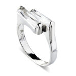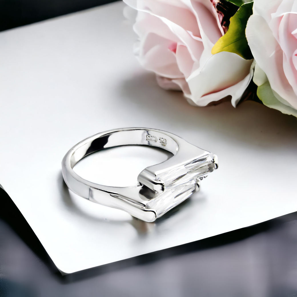 Pierścionek z dwoma prostokątnymi, długimi cyrkoniami.