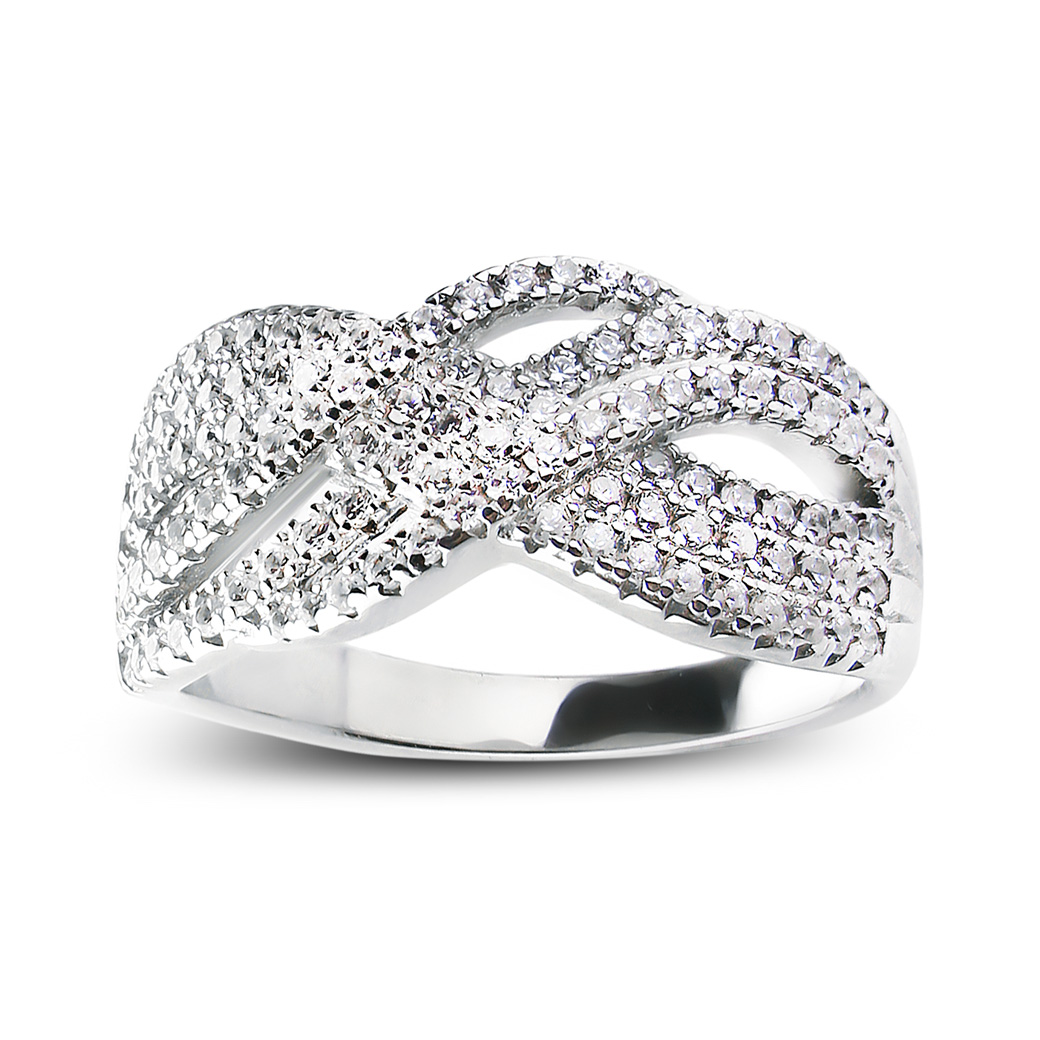 Niezwykle atrakcyjny pierścionek wykonany w motywie pięknego przeplotu, wysadzanego licznymi cyrkoniami.