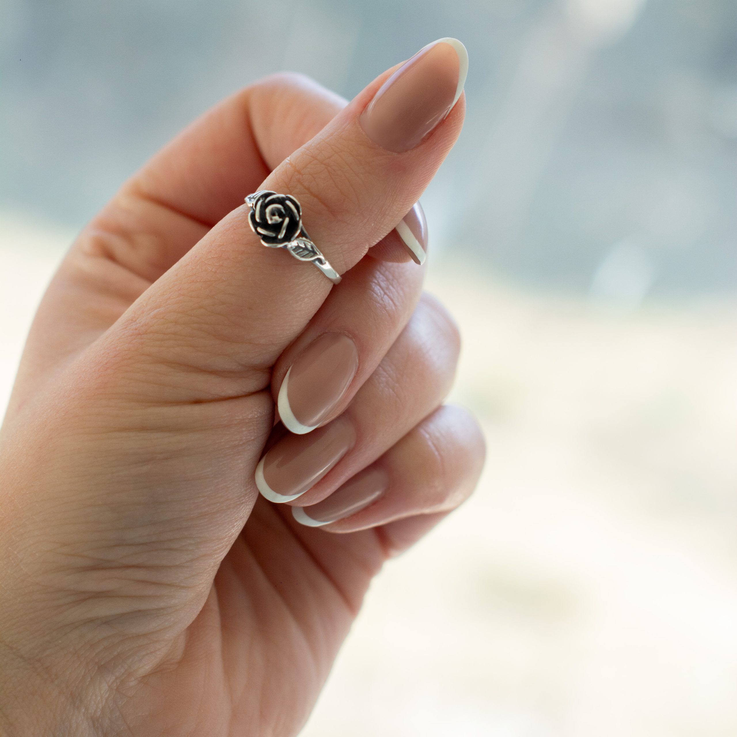 Kwiat róży, który zdobi pierścionek mierzy 9 mm średnicy. Cały zdobiony przód wraz z liśćmi mierzy ok. 1,8 cm długości.
