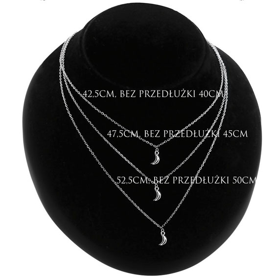 3 połączone ze sobą łańcuszku na jednym zapięciu z przedłużką o długości 5 cm. W zależności d tego czy przedłużka zostanie zastosowana czy też nie – wówczas osiągane są różne długości: