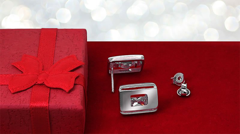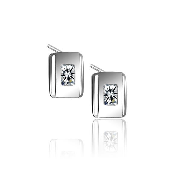 Kolczyki w prostokątnym kształcie, ozdobione białą błyszczącą się cyrkonią o wymiarach 7×5 mm. Wykonane ze srebra próby 925.