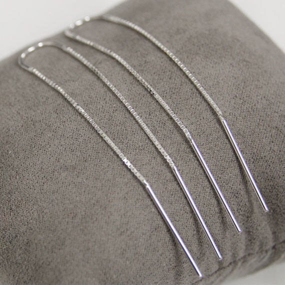 Kolczyki przekładane – podwójne. Posiadają usztywnienie w kształcie litery “U”, które sprawia, że łańcuszek nie przesuwa się, a kolczyki znajdują się na swoim miejscu.