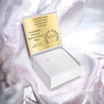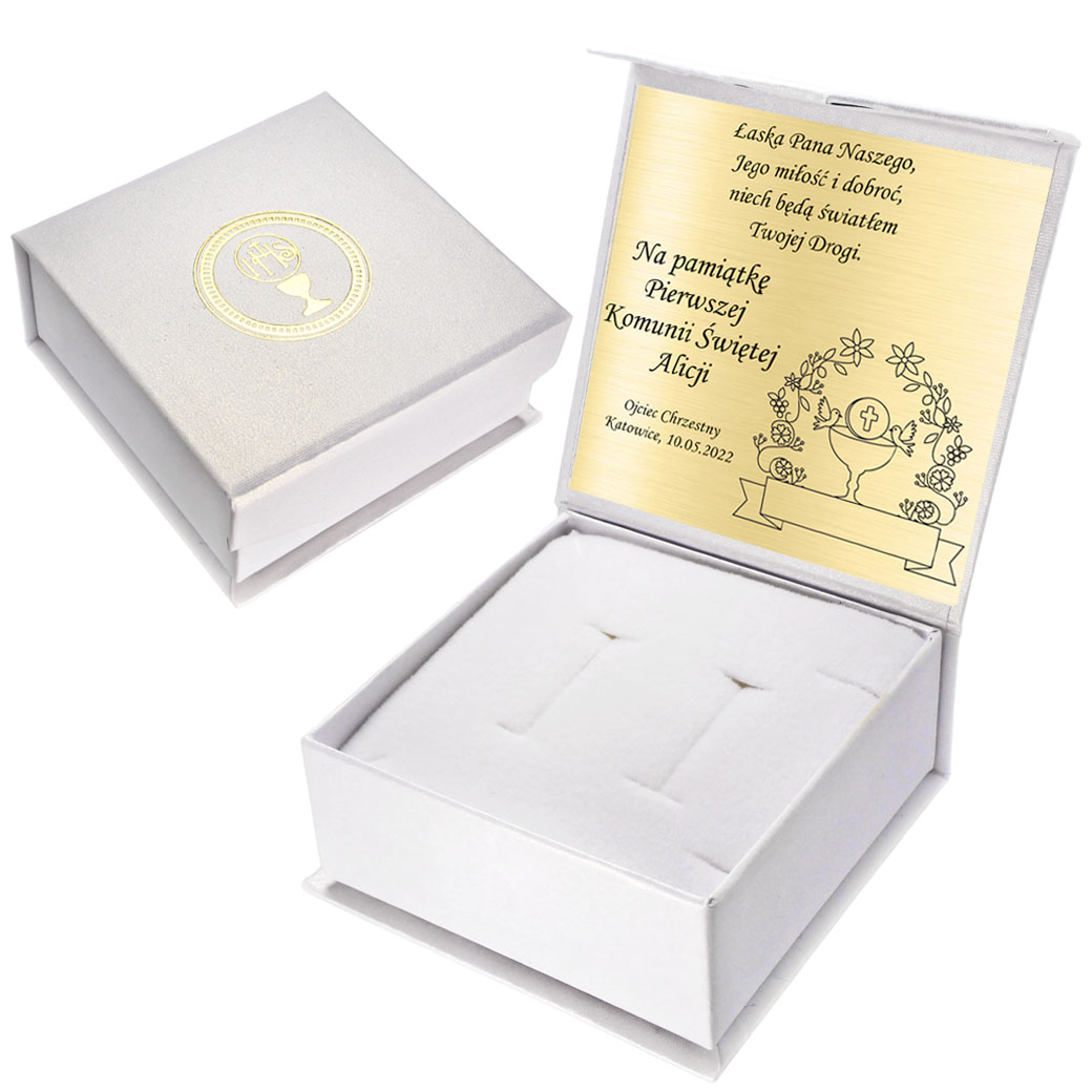 Prezent na Pierwszą Komunię Świętą w pięknej oprawie. Białe i bardzo eleganckie pudełko. Pudełko zamykane na magnes, z białą poduszką w środku. Do pudełka dołączona jest złota tabliczka ze spersonalizowanym grawerem. To Ty decydujesz jaki tekst zostanie umieszczony na tabliczce! Dodatkowo możesz wybrać grafikę – wybierz z rozwijanej listy.