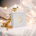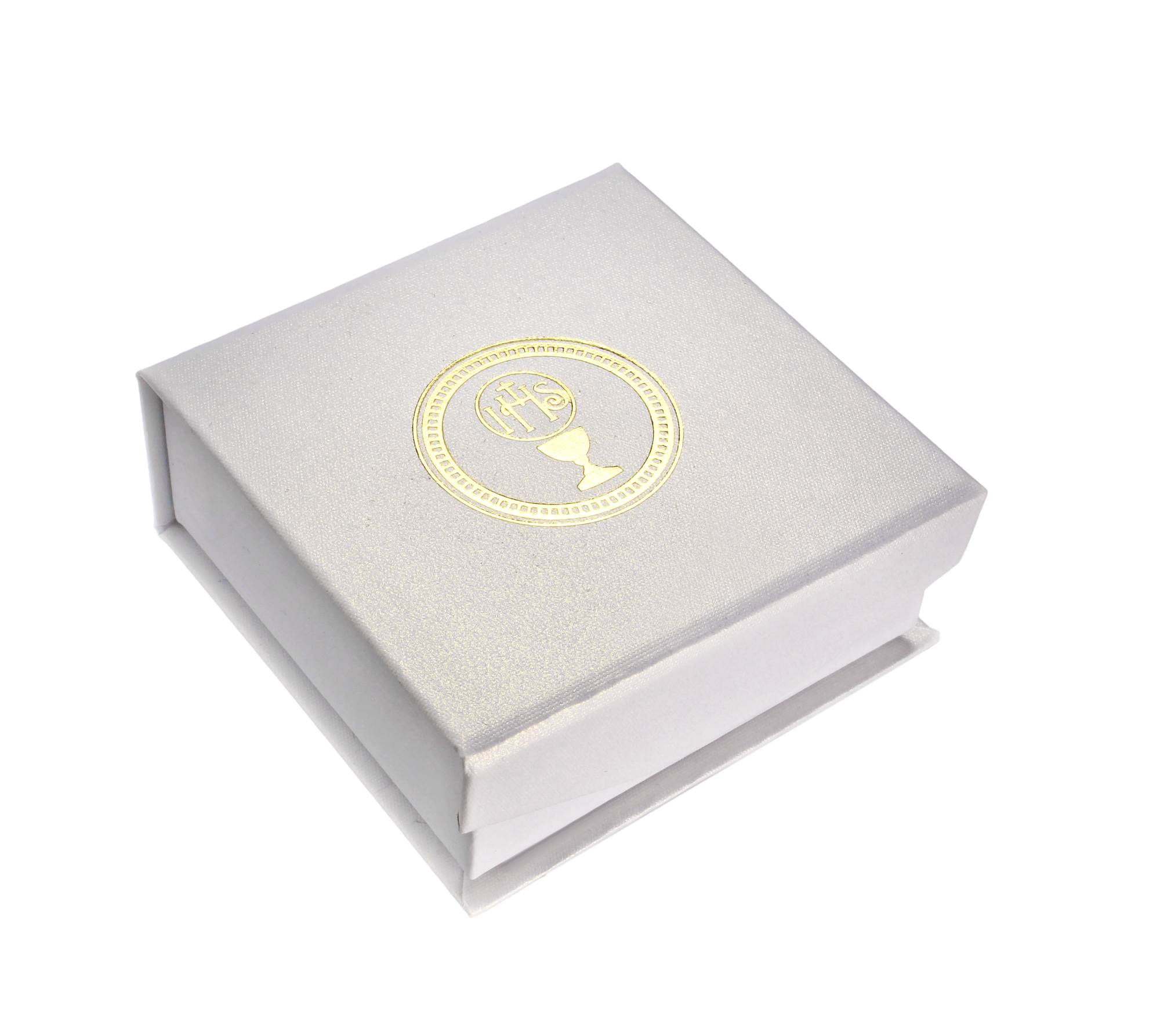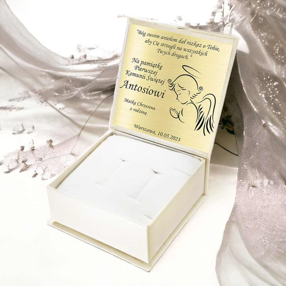 Prezent na Pierwszą Komunię Świętą w pięknej oprawie. Białe i bardzo eleganckie pudełko. Pudełko zamykane na magnes, z białą poduszką w środku. Do pudełka dołączona jest złota tabliczka ze spersonalizowanym grawerem (wzory do wyboru).