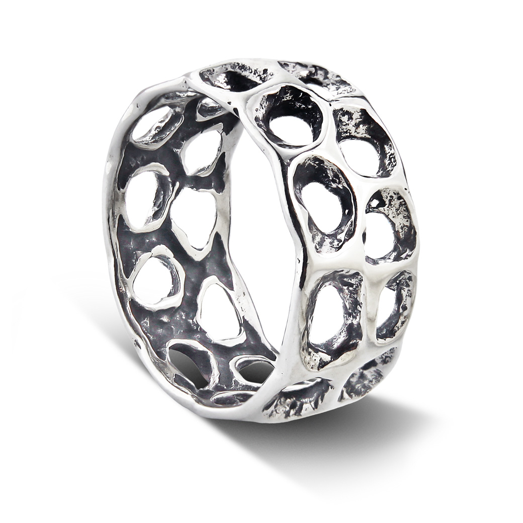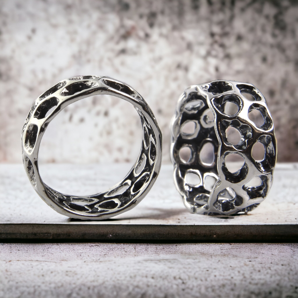 Charakterna biżuteria w artystycznej wizji. Obrączka szeroka, zwracająca uwagę.