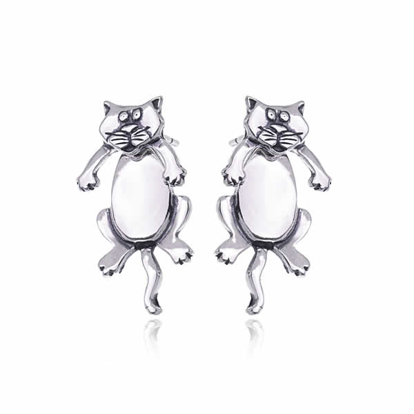 Wysokiej jakości srebrne kolczyki przedstawiające urocze kotki. Wykonane zostały z oksydowanego srebra próby 925, posiadają wygodne zapięcie typu sztyft. Kolczyki został bardzo ciekawie zaprojektowane – składają się z dwóch części – tułowia i głowy kotka. Taki kształt kolczyków sprawia, że można ruszać głową kotka lub nosić kolczyki w dwóch opcjach – w postaci całego kotka lub tylko jego buzi. 🙂 Kolczyki o całkowitej długości 3cm i szerokości ok. 1,6cm. Waga kompletu 5,1g.